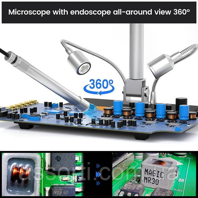 Цифровий мікроскоп AD409 Pro ES з ендоскопом та екраном 10.1 дюйма для ремонту електроніки та пайки. Andonstar Особливості: - Мікроскоп з ендоскопом кругового огляду 360°: оснащений ендоскопом для чіткого спостереження за сторонами компонентів, внутрішньою частиною труб тощо, що дозволяє спостерігати на 360° без мертвих кутів. - Мікроскоп із металевою підставкою Pro: оснащений найновішим модернізованим кронштейном Pro від Andonstar (розмір: 7 x 7,8 x 13 дюймів), кут нахилу кронштейна регулюється спереду та ззаду, і його можна повертати на 360° по горизонталі. Велика металева опорна пластина та більша робоча відстань можуть задовольнити ваші потреби у ремонті великих друкованих плат.