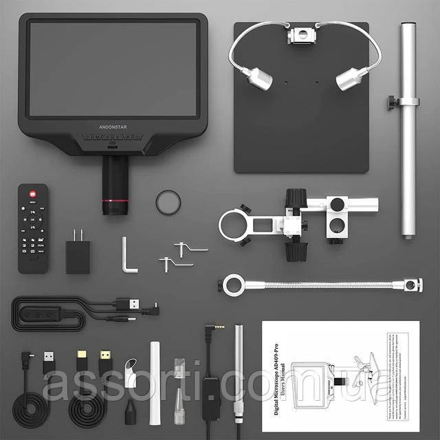| Стандартна комплектація | Мікроскоп × 1 Металева підставка × 1 УФ-фільтр × 1 Шнур живлення × 1 Кабель HDMI × 1 Кабель USB × 1 Адаптер живлення × 1 Металевий затискач × 2 Пульт дистанційного керування × 1 Посібник з експлуатації × 1 Ендоскоп × 1 |
